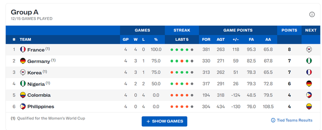 韩国队目前3胜1负排在小组第三,净胜分+51,目前韩国队只输给了德国队,余下一场比赛是对阵小组第一的法国队,这场比赛韩国队大概率也要失利,但德国队是东道主不占用晋级名额,换言之韩国队就算输掉最后一场也会锁定一张世界杯的门票。