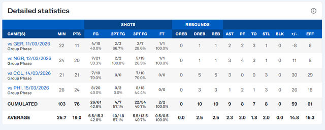 她的四场比赛三分球54中22,三分命中率高达40.7%,场均25.7分钟,拿到19分2.5篮板2.3助攻2抢断,命中率42.6%,三分命中率40.7%。