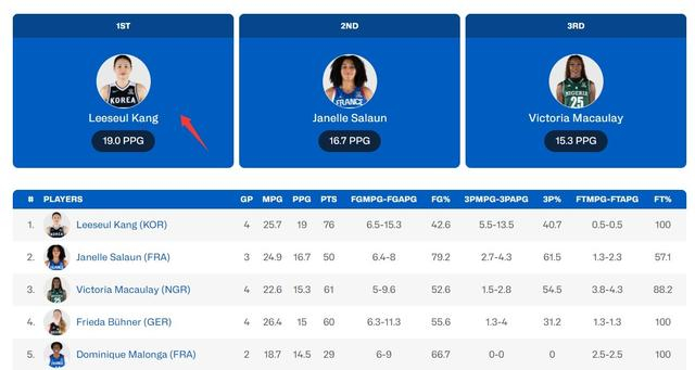 姜怡瑟场均19分是该分区第一,场均5.5个三分球也是分区第一,场均2个抢断也是分区第一,不得不说这位32岁的老将真的是以一己之力扛起了孱弱的韩国女篮。